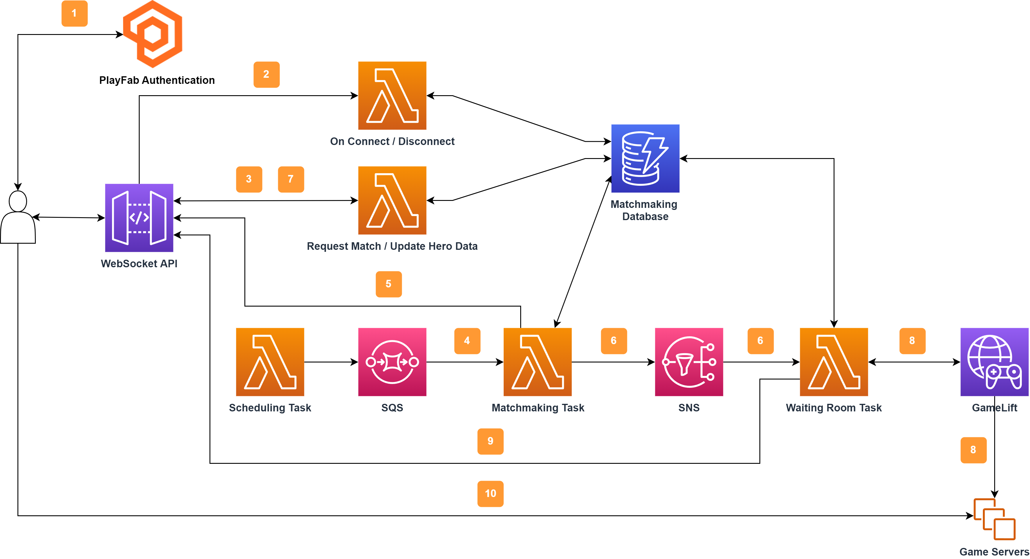 We wanted all the logic to run in the Lambda environment, but there was an important technical issue: the minimum time between runs for scheduled tasks in AWS Lambda is 1 minute, which is unacceptable, as users would have to wait well over 1 minute to enter a match, considering all the time needed for player choices, server allocation and client connection.